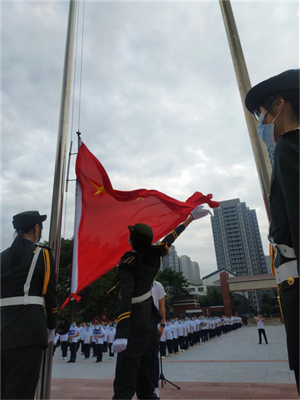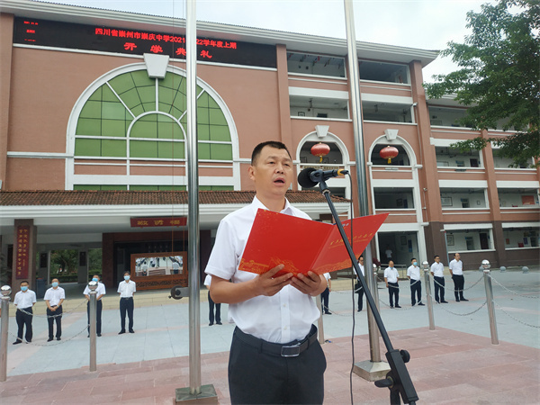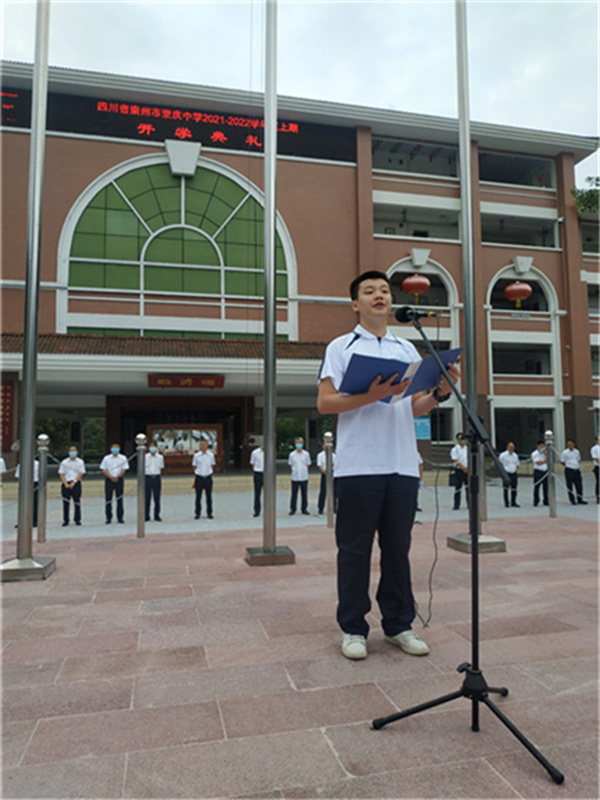升旗仪式上,全体肃立奏唱国歌。崇庆中学校长高强在新学期致辞中回顾了崇庆中学悠久的历史和辉煌的过去。展望未来,高强校长勉励大家:“在伟大的中国共产党成立100周年之际,在祖国脱贫攻坚事业取得决定性胜利的历史时刻,我校全体师生要继续发扬崇庆中学爱党爱国爱人民的光荣传统,传承红色基因,积极投身到中华民族伟大的复兴大潮中去。老师们要按照党的十九大对新时代教师提出的更高要求,努力工作;学生们要励志苦学,力争把自己塑造成为高素质的国家未来建设者,报效祖国。”高强校长对全体同学提出四点希望,并希望同学们斗争昂扬地站上新的起跑线,奋力拼搏,为百年崇中增光添彩。