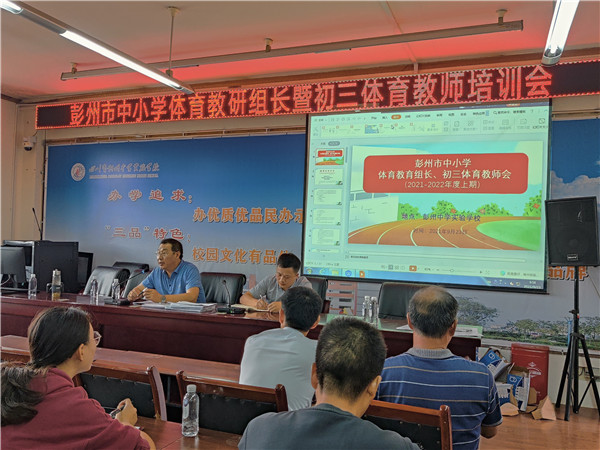 为迎接2022年成都市体育新中考,提升彭州市中小学体育教学水平,提高体育教师的专业素养和教学能力,抓好体育课堂教学常规,增强学生体质和体育运动能力,探究中考体考工作的组织和操作流程。2021年9月23日,彭州市教育局教研室在彭州中学实验学校召开了彭州市中小学体育教研组长暨初三体育教师培训会。