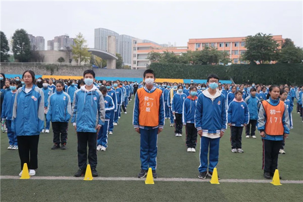 警报一拉响,同学们在班主任、科任老师的带领下按照指定逃生路线开始有序撤离,老师们在教学楼各楼层、楼梯口、路口指挥同学们有序疏散,安全撤离。按照要求,同学们单手捂住口鼻,低头弯腰,沿指定疏散路线快速下楼。短短4分钟,全校4500余名师生安全有序从教学楼撤离到足球场。随后由班主任清点本班学生人数报年级组长,各年级组长向何少衡校长汇报撤离情况。