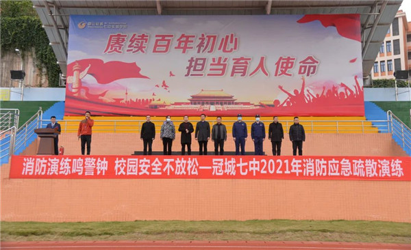 为了进一步普及消防安全知识,增强师生的消防安全意识,掌握面对火灾时迅速逃生、自救互救的基本技能,提高师生抵御火灾和应对紧急突发事件的能力,2021年11月9日上午9:20,模拟真实情景,冠城七中全体师生进行了消防安全应急疏散演练。