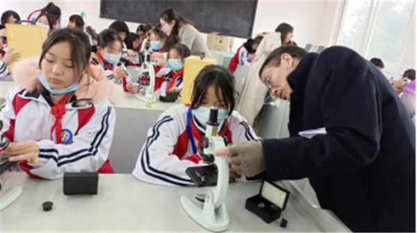 工作室还为三岔中学的同学们展示了三台高配数码版显微镜。在工作室老师们的指导下,同学们很快就调整好了显微镜,亲自动手装片,利用显微镜观察各类固定装片,在高配数码版显微镜的显示屏上直接观察细胞的显微结构。同学们兴奋异常,陶醉于探究学习所带来的乐趣中,无不感叹生物微观世界的神奇和生命的魅力。