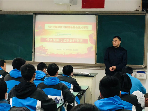 近日,成都市人北中学党支部书记陈悦熙同志在八年级三班,以《将全面深化改革进行到底》为题,开展专题思政课教学。