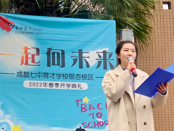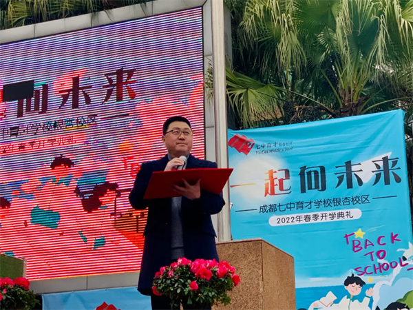 七中育才学校银杏校区执行校长姜向阳发表了主题为“爱成都,迎大运,向未来”的开学致辞。他提到:在新学期,学校将继续践行立德树人的根本目标,五育并举、落实五项管理,践行“重德育才、面向未来、最优发展”的学校文化,开设丰富多彩、形式多样的活动课、选修课、社团课。同时,他也希望同学们在新学期开启新旅程,涂抹新色彩,积极参加各项活动,加强体育锻炼,全面发展、个性发展,做健康高雅、聪慧大气的育才学子,在学校有快乐幸福的生活,在未来成为有终身学力、全面适应力的优秀人才。