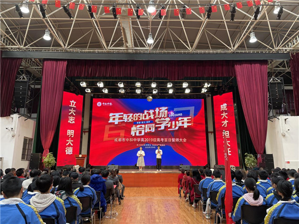 为鼓舞斗志,提振精神,3月4日,成都市中和中学举行了“年轻的战场 恰同学少年”高2019级高考百日誓师大会。校长陈伦全、部分学校领导、高三年级全体老师、学生及家长代表出席了大会。