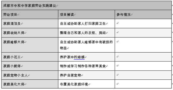 为了进一步贯彻落实“五育并举”,让学生树立良好的劳动习惯,加强学生的劳动教育,养成劳动习惯,锻炼劳动品质,让他们具备家务劳动能力,促进学生素质的全面发展,成都市中和中学结合学校学生劳动教育实践的需要,德育处为学生们提供了日常家庭劳动建议,希望学生们在日常生活中,习得必备的家务劳动技能。