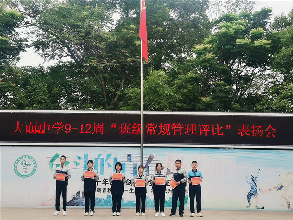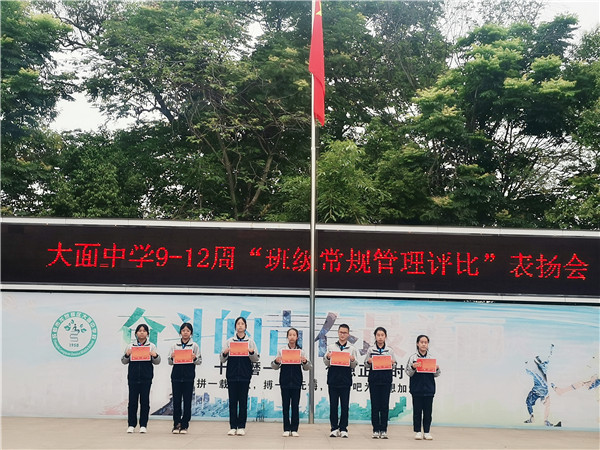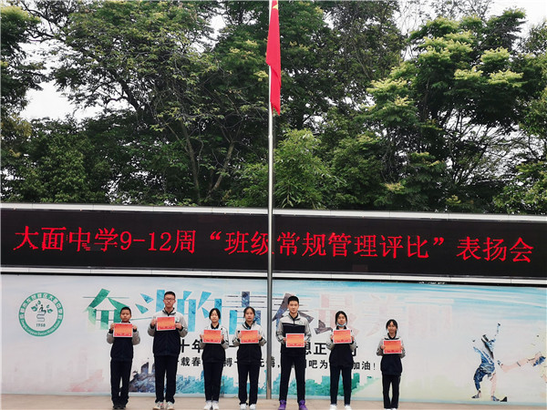 为加强学校常规管理工作,营造安静整洁的育人环境,成都市龙泉驿区大面中学校开展学月班级管理单项奖评比,评比的内容有学生零食管理、仪容着装管理、午间就餐管理等方面。2022年5月16日,学校举行了班级常规管理表扬会,表扬会由陈柳主任主持,校领导为受表扬班级颁奖。