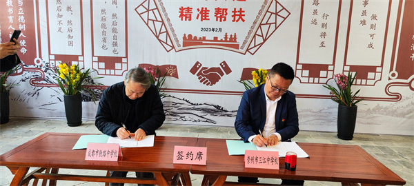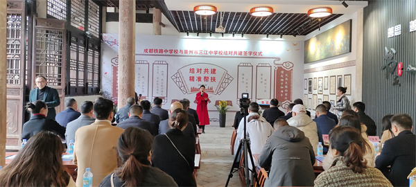 为切实加强圈层教育交流与合作,促进城乡教育均衡发展,2023年2月24日,成都市铁路中学教育集团与崇州市三江中学“结对共建精准帮扶”签字仪式在三江中学举行。市教育局党组书记、局长伍建光,成都市铁路中学教育集团党委书记、校长胡铃冬,市教育局班子成员、教培中心主任刘伏元,基础教育科副科长李斌,三江街道副主任肖洪强,三江片区兄弟学校领导、部分家长代表,三江中学行政和部分教师代表共计60余人参加了此次活动。活动由三江中学教科室主任易霞主持。