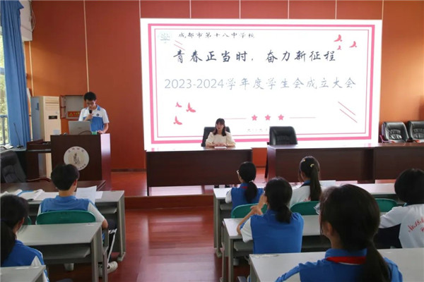 学生会成立大会 9月19日中午,成都十八中2023-2024学年度学生会成立大会在阶梯教室举行。