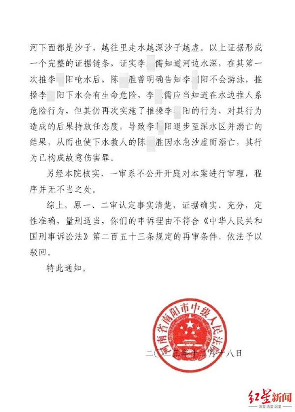 2021年7月11月,四名孩子在河南省南阳市新野县上庄乡一河道内洗澡玩耍时发生悲剧,李某阳(事发时14岁)溺亡,陈某胜(15岁)救人无果被水冲走溺亡。一个多月后,同行的李某儒(15岁)被新野县公安局刑事拘留;12月1日被依法逮捕。2022年7月,一审判决李某儒犯故意伤害罪,获刑11年。二审维持原判。据判决书显示,被告人李某儒向李某阳索要香烟未果,心生怨恨,主观上明知自己行为可能会发生致人溺亡的后果,客观上实施了两次推李某阳至深水区的行为,对李某阳溺亡持放任态度,造成其溺亡后果,行为已构成故意伤害罪。