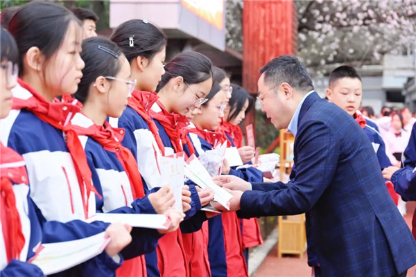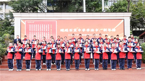 成都石室中学党委副书记、校长刘涛来到现场,为孩子们送上石室中学学法卡和甜甜的新年糖。